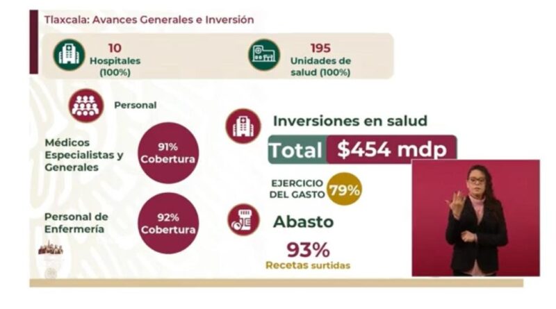 Explicó que la inversión en la entidad es de 453.7 millones de pesos, que se están ejerciendo desde el 29 de julio que empezó a trabajarse de lleno en el estado con el sistema de salud IMSS-Bienestar, para brindar mayor atención de calidad, oportunidad y acceso a la salud.