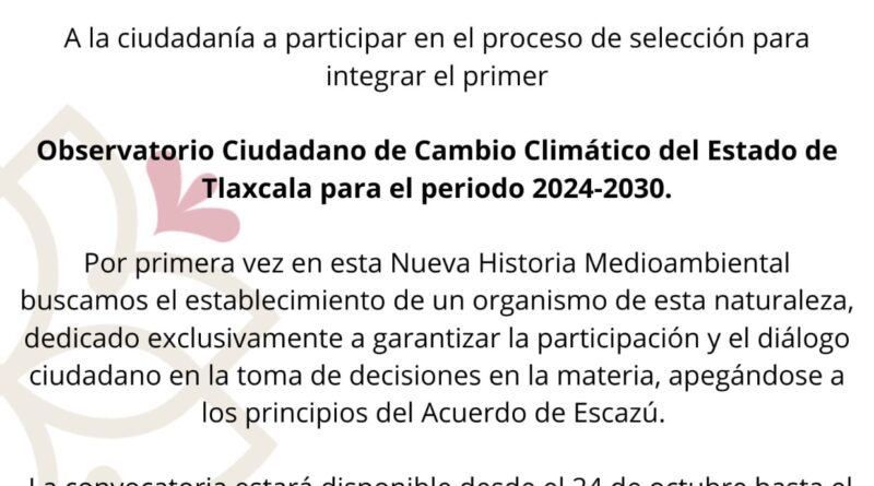 El secretario de Medio Ambiente del estado (SMA), Pedro Aquino Alvarado, en su carácter de secretario Técnico de la Comisión Intersecretarial de Cambio Climático (CICC), invitó a la población tlaxcalteca mayor de edad a participar en la Convocatoria de Proceso de Selección para la Integración del Observatorio Ciudadano de Cambio Climático para el periodo 2024-2030.