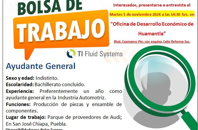 La Coordinación de Desarrollo Económico de Huamantla, en colaboración con la empresa TI Fluid Systems del sector automotriz, invita a la comunidad a participar en un proceso de reclutamiento para la contratación de ayudantes generales, que se llevará a cabo el martes 5 de noviembre.