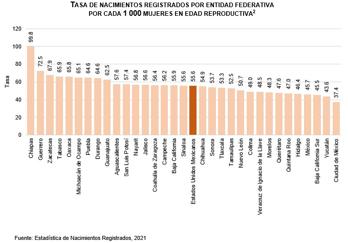 En el contexto nacional, Chiapas fue el estado con la tasa más elevada, al reportar 99.8 nacimientos por cada mil mujeres en edad reproductiva, y en el extremo contrario se situó la Ciudad de México, con una tasa con 37.4 nacimientos por cada mil mujeres.