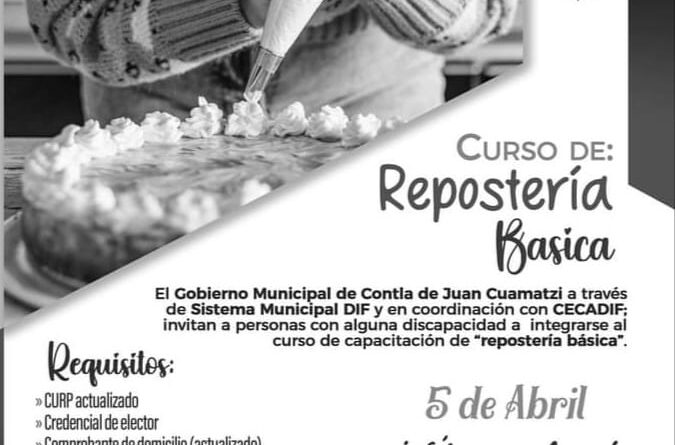 El Sistema Municipal para el Desarrollo Integral de la Familia (SMDIF) de Contla de Juan Cuamatzi, en coordinación con CECADIF invita a personas con alguna discapacidad a inscribirse a los cursos de capacitación de: Globoflexia, panadería básica, repostería básica, carpintería y pintura textil.