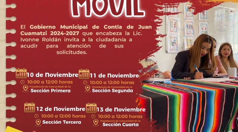 El ayuntamiento de Contla de Juan Cuamatzi, administración 2024-2027, que encabeza la presidenta municipal Ana Ivonne Roldán Xolocotzi, informó que “se reanuda el programa de la Presidencia Móvil, te compartimos la agenda de la Presidencia Móvil este mes, donde estaremos visitando distintas comunidades para atender, escuchar y acompañar tus inquietudes y propuestas para nuestro municipio”.