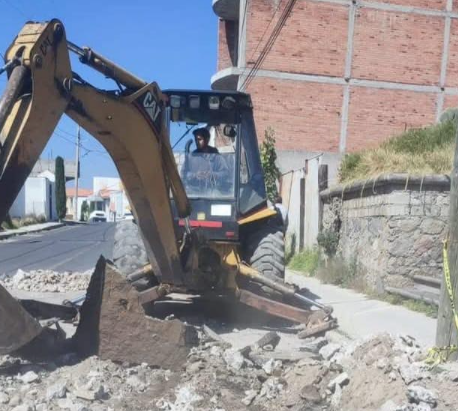 En la calle Prolongación 5 de Febrero, frente a la presidencia de comunidad de San Felipe Cuauhtenco, en este lugar se está rehabilitando la alcantarilla pluvial que presentaba daños estructurales graves.