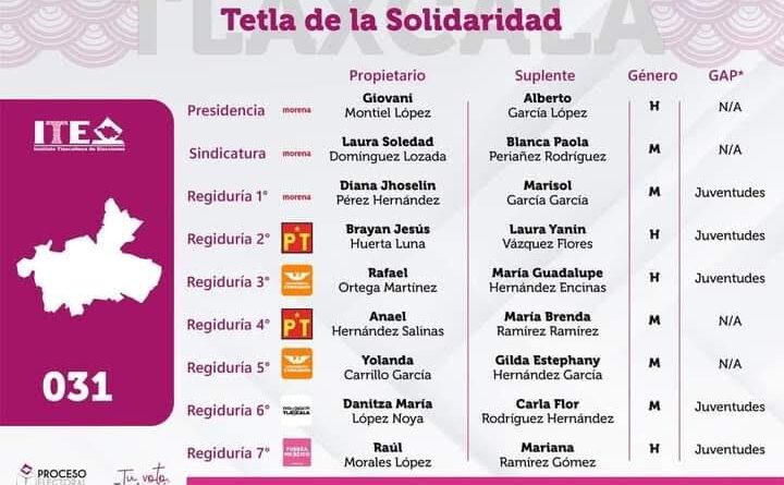 Para el caso de Tetla de la Solidaridad, el cabildo que actualmente gobierna, Andrés Ramírez Galicia, son tres mujeres que están en el cabildo y son: Jazmin Paola Flores Hernández, Quinta regidora; Diana Aleydi Rodríguez Palestina, sexta regidora y Ana María García Palafox, séptima regidora.