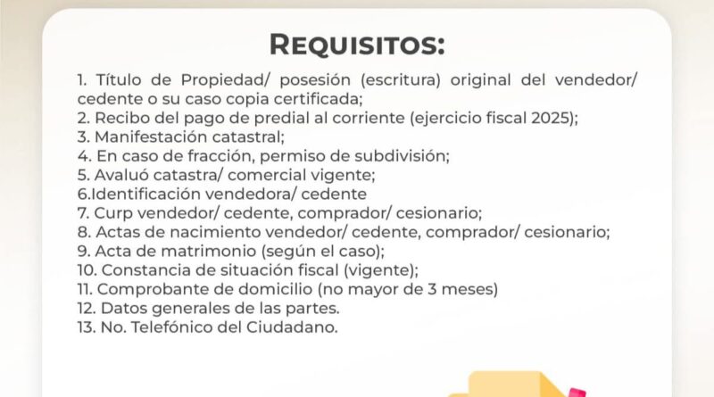 También presentar recibo de pago de predial al corriente (ejercicio fiscal 2025); manifestación catastral, en caso de fracción, presentar permiso de subdivisión, avaluó catastral/comercial vigente; identificación vendedora/cedente; Curp vendedor/cedente comprado/cesionario; actas de nacimiento vendedor/cedente, comprador/cesionario.