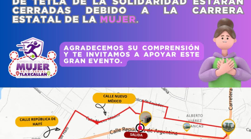 En Tetla de la Solidaridad, el presidente municipal, Giovani Montiel López, conmemorará el Día de la Mujer, con Carrera Atlética, esta dará inicio en punto de las 8 de la mañana, por lo cual serán cerradas las principales calles de la localidad este domingo, piden a los automovilistas tomen precauciones.