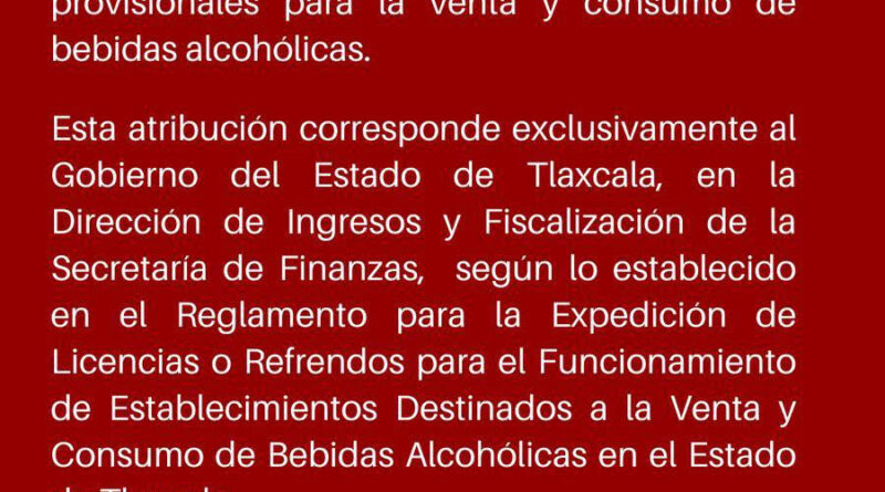 Externo mediante un comunicado que el Ayuntamiento de Tetla de la Solidaridad, informa a la ciudadanía, que, de acuerdo con la normativa vigente en el municipio, no tiene la facultad de expedir permisos eventuales o provisionales, para la venta y consumo de bebidas alcohólicas.