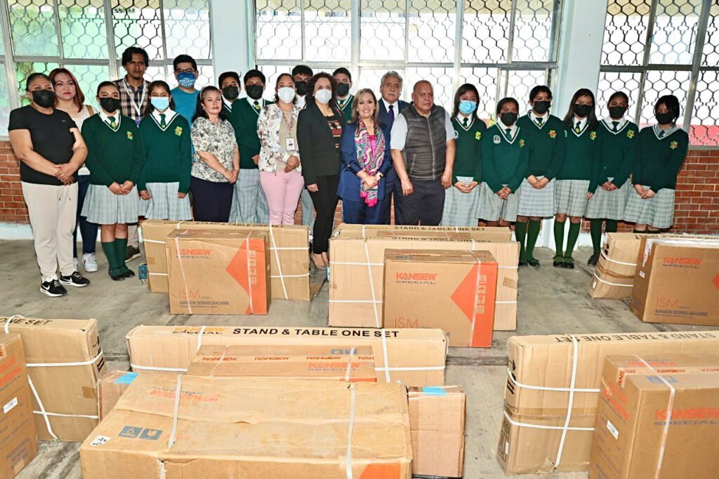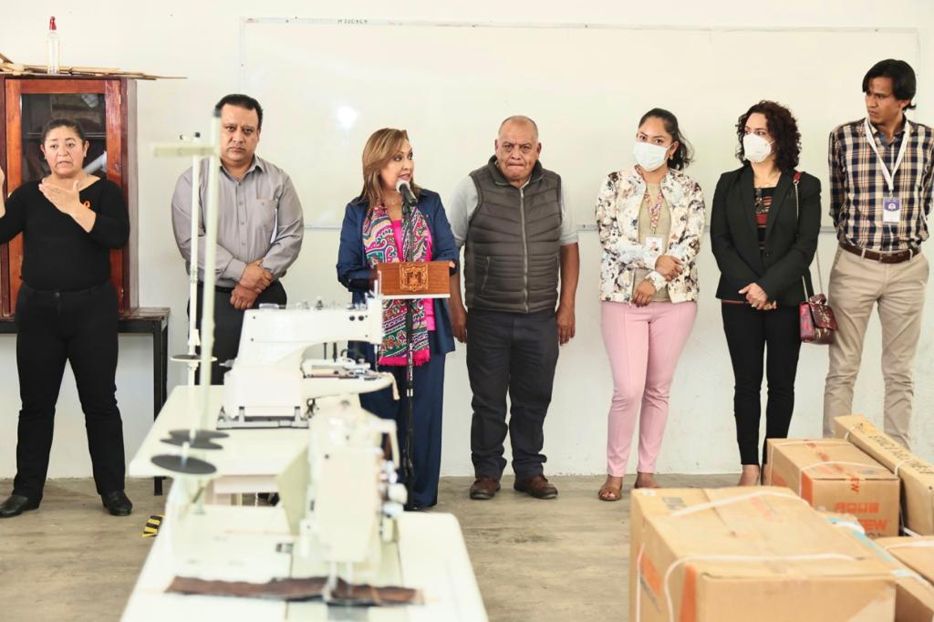La gobernadora Lorena Cuéllar Cisneros entregó equipamiento y máquinas de coser en la Secundaria General “Valentín Gómez Farías” del municipio de Chiautempan, con lo cual se beneficiarán 240 alumnos y alumnas de los turnos matutino y vespertino del taller de Industria del Vestido.