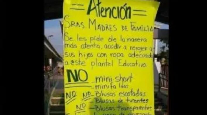 “Atención, Sras. Madres de Familia. Se les pide de la manera más atenta, acudir a recoger a sus hijos con ropa adecuada a este plantel educativo. No minishort, no minifaldas, no blusas escotadas, no blusas de tirantes, no blusas transparentes».