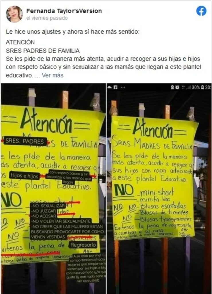 Un letrero pegado afuera de una escuela en Saltillo, Coahuila, ha causado polémica entre padres de familia y en redes sociales, ya que pide a las madres de familia no ir a recoger a sus hijos vestidas de manera “inapropiada”.