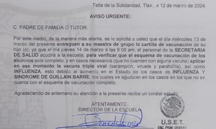 Debido al alza de casos de Síndrome de Guillain-Barré, instituciones educativas toman medidas y solicitan a padres de familia, presentar cartillas de vacunación con esquemas completos, de lo contrario, deberán aplicarse dosis de triple viral (sarampión, viruela y paratiditis), así como influenza.