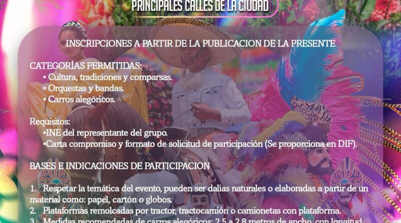 El Sistema Municipal para el Desarrollo Integral de la Familia (DIF) de Huamantla, emitió a través de sus redes sociales la Convocatoria para participar en el Gran Desfile de las Dalias en el marco de la Feria Internacional del Arte Efímero y la Dalia 2024.
