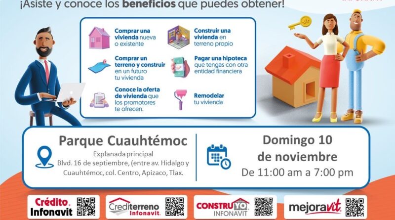 El Gobierno Municipal de Apizaco y el Instituto del Fondo Nacional de la Vivienda para los Trabajadores (Infonavit) invitan a las y los derechohabientes a participar en la próxima Feria de Crédito, donde podrán conocer y acceder a diversas opciones de financiamiento para mejorar o adquirir su vivienda.