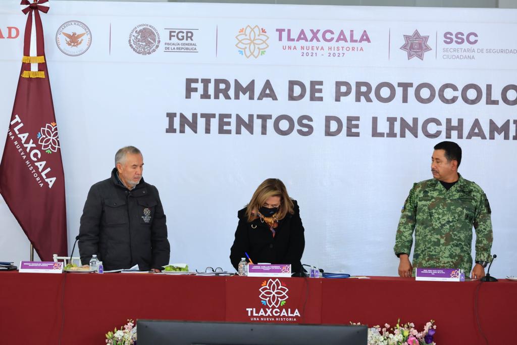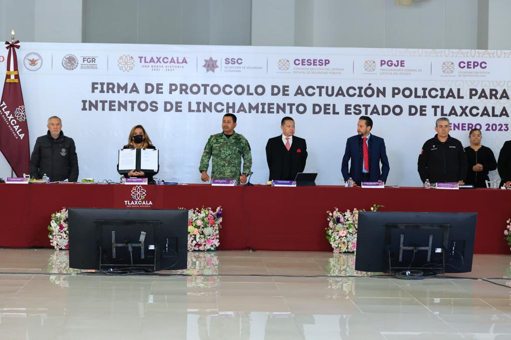 La gobernadora Lorena Cuéllar Cisneros encabezó la firma del “Protocolo de Actuación Policial para Intentos de Linchamiento del Estado de Tlaxcala”, signada con presidentas y presidentes de los 60 municipios, el cual tiene como objetivo prevenir, reaccionar y atender de manera oportuna este tipo de situaciones para garantizar la seguridad y la paz social.
