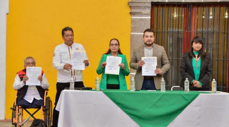 El presidente municipal de Huamantla, Salvador Santos Cedillo, conjuntamente con autoridades del H. Ayuntamiento y el representante de los artesanos del municipio, llevaron a cabo la firma de convenio de comodato del Pabellón Artesanal del Parque Juárez.