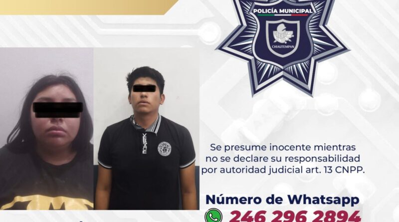 Por estos hechos, Angélica N., y Gerardo N., de 19 y 23 años de edad, respectivamente, fueron trasladados a la Dirección de Seguridad Pública Municipal, Vialidad y Protección Civil de Chiautempan para la puesta a disposición correspondiente.