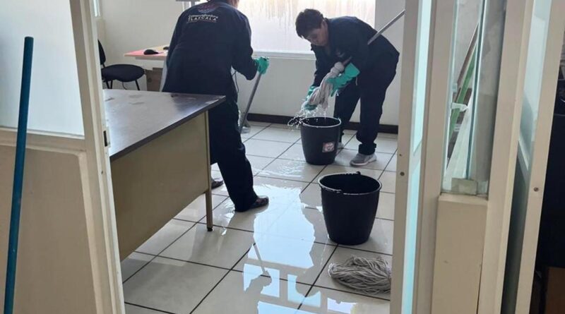 Una fuga, causada presuntamente por una obra mal ejecutada, causó inundaciones leves en la Casa de Justicia del Distrito Judicial de Sánchez Piedras, en el municipio de Apizaco.