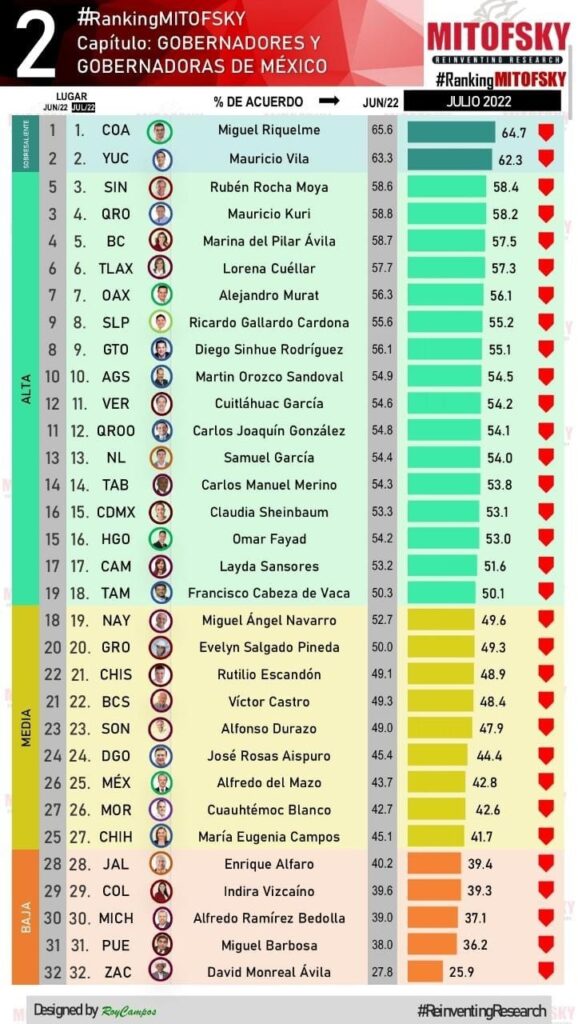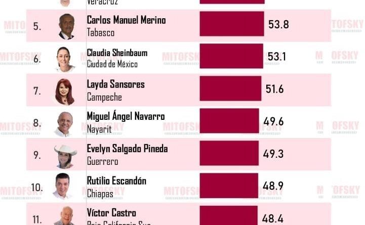 Respecto a la aprobación de mandatarios morenistas, ocupa el tercer lugar, por arriba de los gobernadores de Veracruz, Cuitláhuac García y de Tabasco, Carlos Manuel Merino.