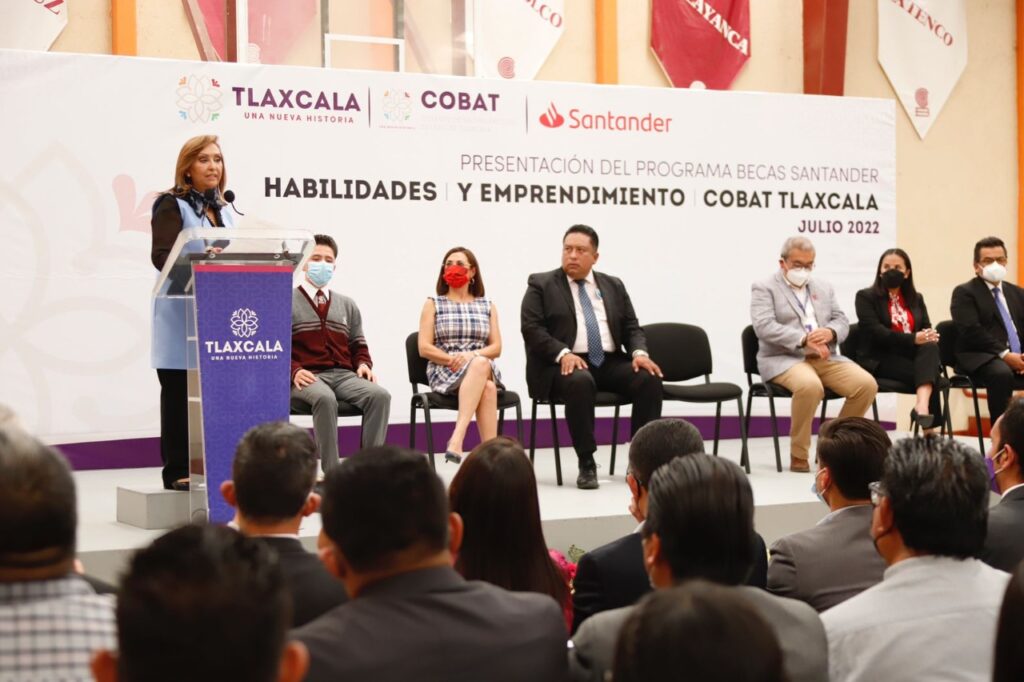 La gobernadora Lorena Cuéllar Cisneros y Santander Universidades entregaron becas de modalidad online a estudiantes, directivos y personal docente del Colegio de Bachilleres del Estado de Tlaxcala (Cobat), a fin de contribuir en el desarrollo de sus habilidades blandas y digitales e incentivar la profesionalización académica.
