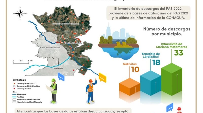 En este sentido y como resultado del trabajo coordinado entre el estado, la Federación y los municipios, se refiere que el inventario de descargas del PAS 2022 asciende a un total de 61 puntos de descarga en las comunas de las cuales 33 corresponden a Ixtacuixtla, 18 a Tepetitla y 10 a Natívitas, por lo que en coordinación con los alcaldes se realizan los trabajos de saneamiento correspondientes a fin de evitar esta problemática.
