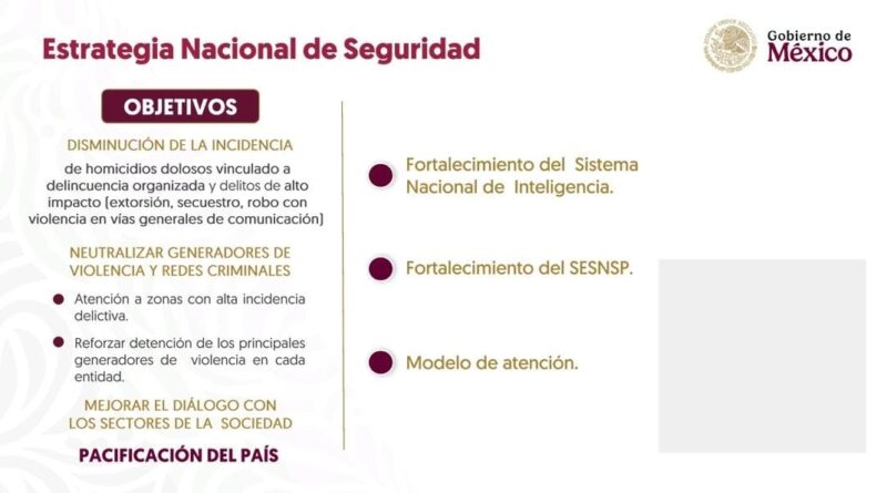 El pasado 8 de octubre, la presidenta Sheinbaum Pardo presentó la estrategia, en la que resaltó la importancia de atender las causas de la violencia, consolidar a la Guardia Nacional, fortalecer la inteligencia e investigación y coordinar con las entidades federativas, que son los cuatro ejes de la estrategia.