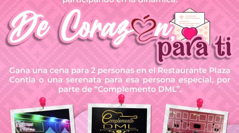Como parte de las festividades para conmemorar el Día del Amor y la Amistad, el Gobierno Municipal de Contla de Juan Cuamatzi a través del Instituto Municipal de la Juventud; emprendieron una dinámica para que la ciudadanía tenga la oportunidad de ganar una cena y una serenata, para celebrar con su pareja o alguna amistad. La dinámica llamada “” De Corazón para ti”, consiste en que los participantes deberán escribir una corta contando brevemente su historia con la persona que desean disfrutar del premio y los motivos por el que les gustaría ser los ganadores; la serenata se realizará la madrugada del 14 de febrero por parte del grupo “Complemento DML”, y por la tarde-noche, se realizará la cena para dos personas en el restaurante “Plaza Contla”.