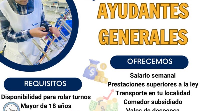 Para esta vacante ofertada, se requiere ser mayor de 18 años, asimismo el sexo es indistinto. Además se ofrece un sueldo semanal, así como prestaciones de Ley, transporte a la localidad a la que pertenezca el interesado, comedor subsidiado y vales de despensa.