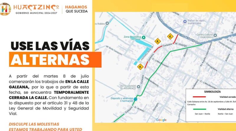 El presidente municipal anunció que, a partir de este 8 de julio, la calle que conecta desde la avenida 16 de septiembre (carretera a Nativitas) y hasta la salida hacia Val´Quirico, permanecerá cerrada por tiempo indefinido.