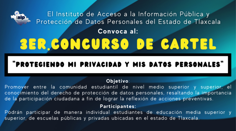 El Instituto de Acceso a la Información Pública y Protección de Datos Personales del Estado de Tlaxcala (IAIP), publicó la convocatoria para el Tercer Concurso de Cartel, “Protegiendo mi privacidad y mis datos personales”, que busca motivar la reflexión en torno al correcto uso de la información personal de la comunidad estudiantil.