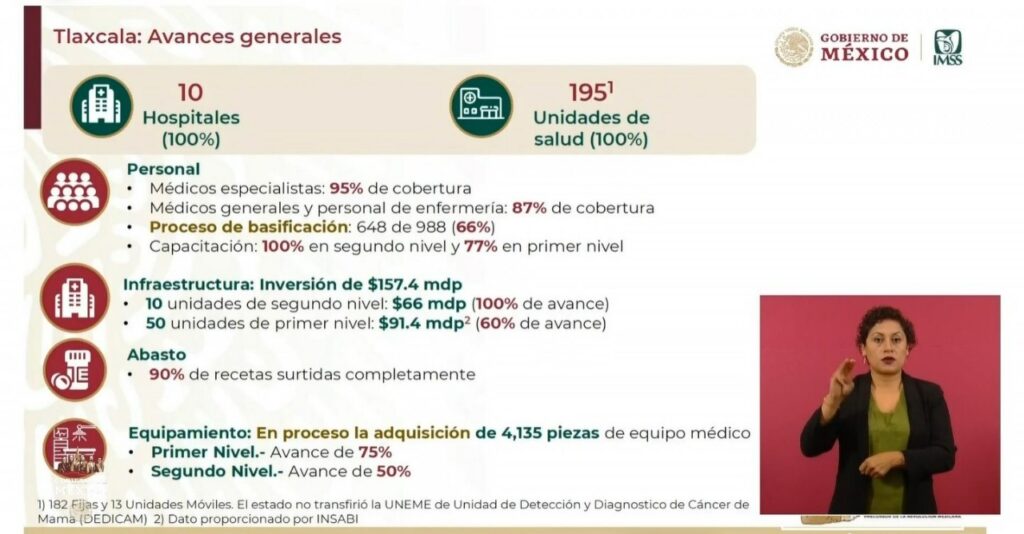 Agregó que el IMSS-Bienestar funciona en 10 hospitales, una unidad de especialidad UNEME de diagnóstico y detección de cáncer de mama y en 195 Centros de Salud de Tlaxcala.