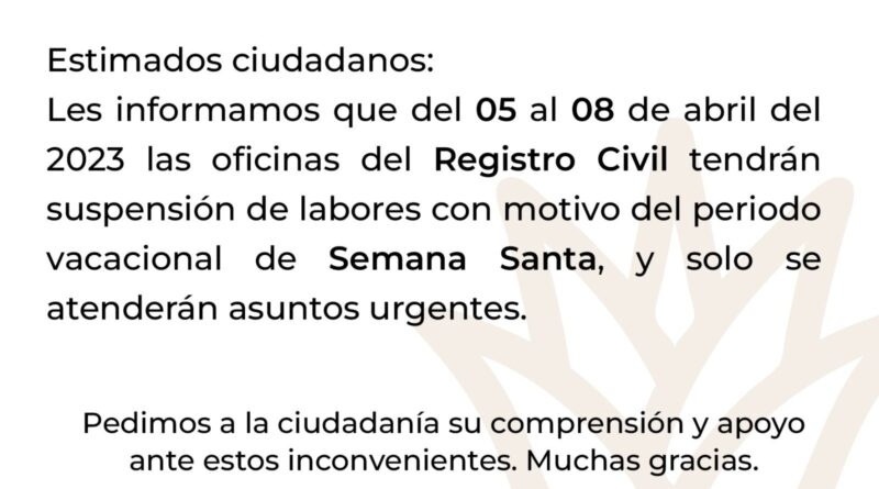 El Ayuntamiento de Chiautempan, informa sobre la suspensión de actividades en las oficinas de Registro Civil del municipio, por motivo del festejo de la Semana Santa 2023.