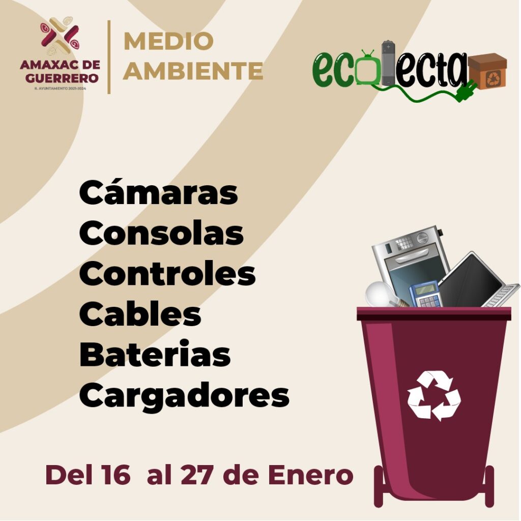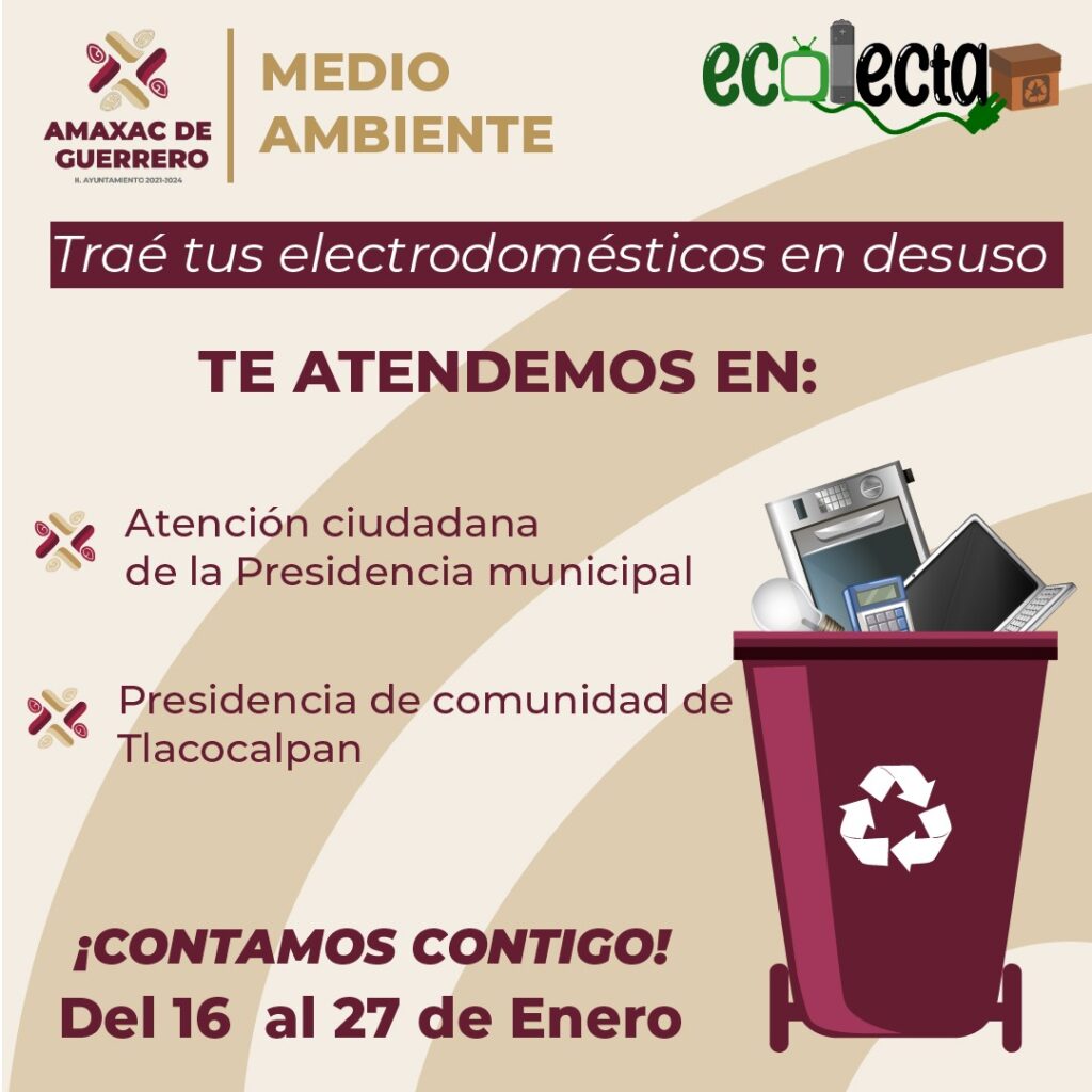 Para contar con un municipio limpio y fomentar la cultura del reciclaje, el Ayuntamiento de Amaxac de Guerrero, a través de la Unidad de Municipal de Medio ambiente inició la campaña de reciclaje de aparatos electrodomésticos llamada “Ecolecta”, misma que busca recolectar aquellos aparatos que ya están en desuso que se realizará del 16 al 27 de enero.