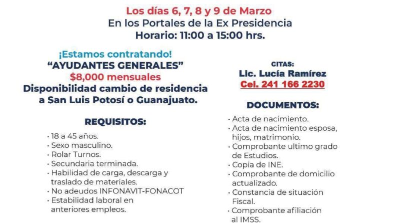 Del 07 al 09 de marzo del presente año, los interesados en las vacantes para ayudante general podrán acudir a los portales de la Ex presidencia municipal en un horario de 11:00 a 15:00 Hrs. para iniciar su proceso de reclutamiento o bien, conocer sobre la oferta laboral.