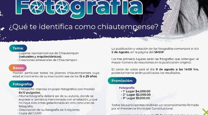 El Ayuntamiento de Chiautempan a través del Instituto Municipal de la Juventud (IMJ), invita a las y los jóvenes del municipio a participar en el concurso de fotografía ¿Qué te identifica como chiautempense? organizado en el marco del mes de la juventud.