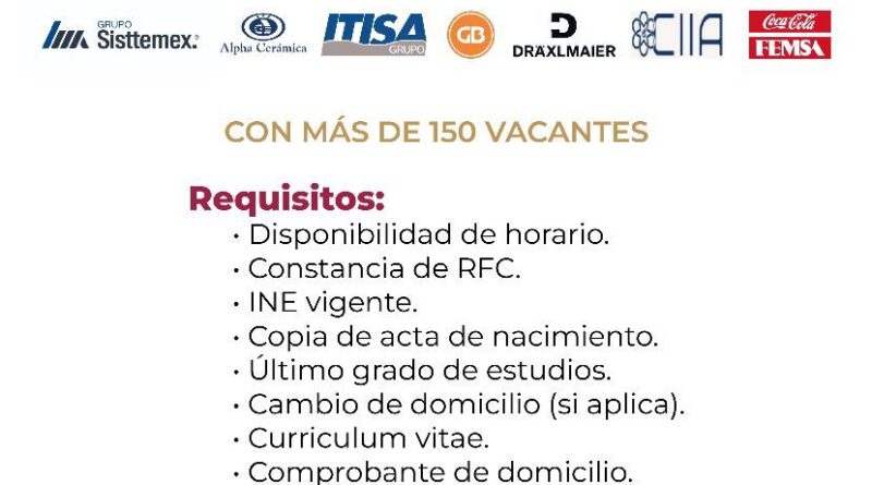En esta Feria, se ofertarán más de 150 vacantes de empresas como: Grupo Sisttemex, Alpha Cerámica, Grupo ITISA, GB, DRAXLMAIER, CIIA, Coca Cola – FEMSA, entre otras.