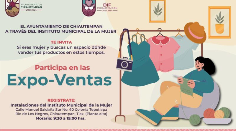 El Ayuntamiento de Chiautempan en coordinación con el Sistema Municipal para el Desarrollo Integral de la Familia (SMDIF) a través del Instituto Municipal de la Mujer, invita a todas las mujeres chiautempenses a participar en las Expo-Ventas, con la finalidad de que puedan exponer de manera gratuita sus productos y así aumentar sus ventas.