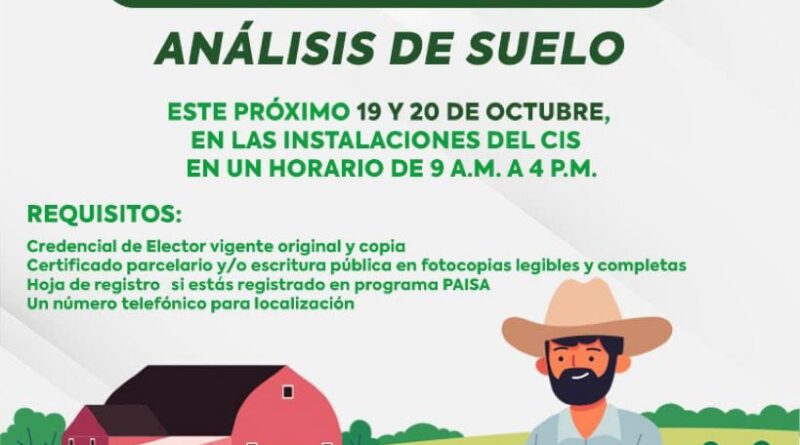 La Secretaría de Impulso Agropecuario, en coordinación con el H. Ayuntamiento de Huamantla, invitan a las y los agricultores a realizar su trámite de análisis de suelo, el cual se llevará a cabo este 19 y 20 de octubre en las instalaciones de la Coordinación de Agricultura y Desarrollo Rural del municipio.