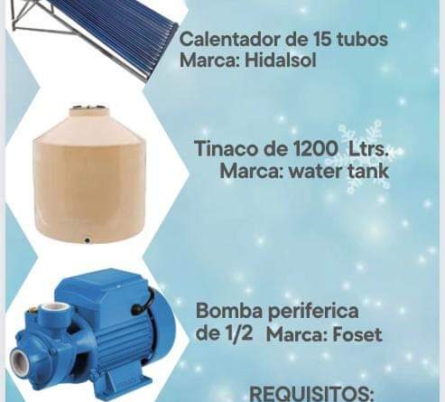 - El paquete incluye un calentador solar, un tinaco de 1200 litros y una bomba periférica con un costo de 5 mil 700 pesos