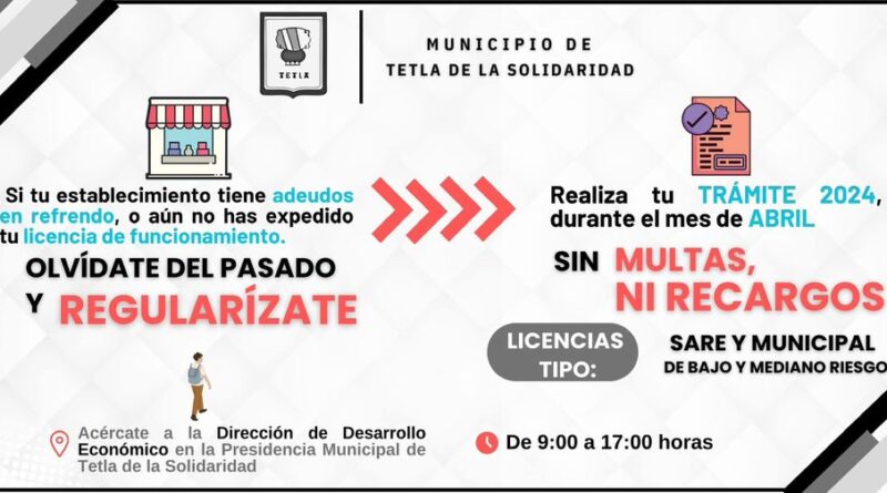 El Ayuntamiento de Tetla de la Solidaridad, exhorta a todos los establecimientos que tengan adeudos en refrendo o que aún no hayan expedido su licencia de funcionamiento, a regularizarse con su trámite 2024, todo el mes de abril, sin multas, ni recargos.