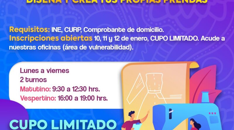 Además, señaló que el taller se llevará a cabo de lunes a viernes en dos turnos: de 9:30 a 12:30 horas; y de 14:00 a 19:00 horas. Los requisitos para registrarse son copia de INE, CURP y comprobante de domicilio vigente (con un máximo de 3 meses de antigüedad).
