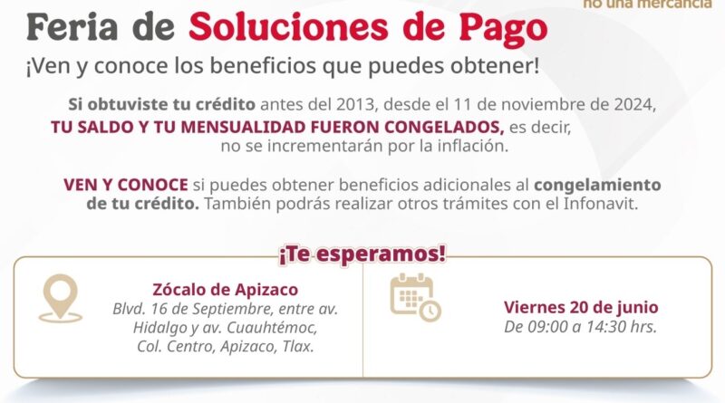 El Gobierno municipal de Apizaco en coordinación con el Instituto del Fondo Nacional de la Vivienda para los Trabajadores (Infonavit) en Tlaxcala, invita a las y los derechohabientes del municipio a participar en la Feria de Soluciones de Pago, un evento diseñado para brindar apoyo a personas con créditos activos.