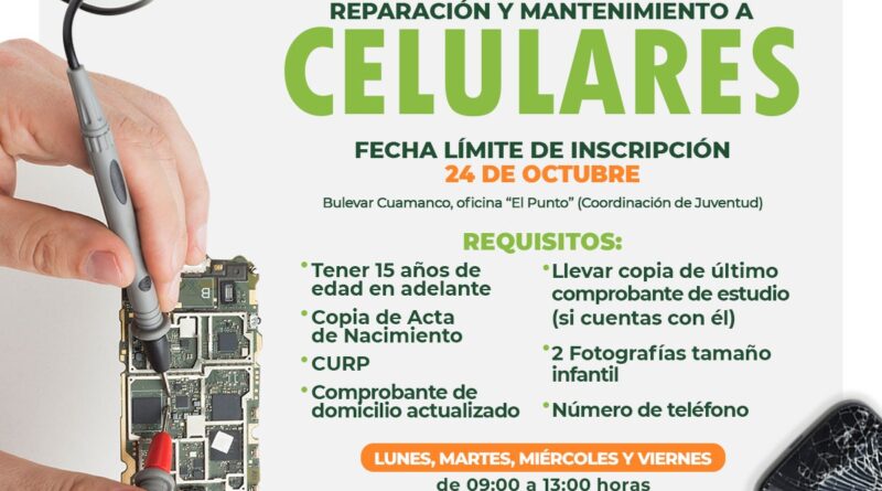 El Gobierno Municipal de Huamantla, a través de la Coordinación de Juventud, y en colaboración con el Instituto de Capacitación para el Trabajo del Estado de Tlaxcala (Icatlax), invita a las y los jóvenes con 15 años de edad en adelante a participar en el curso de “Reparación y Mantenimiento a Celulares”.
