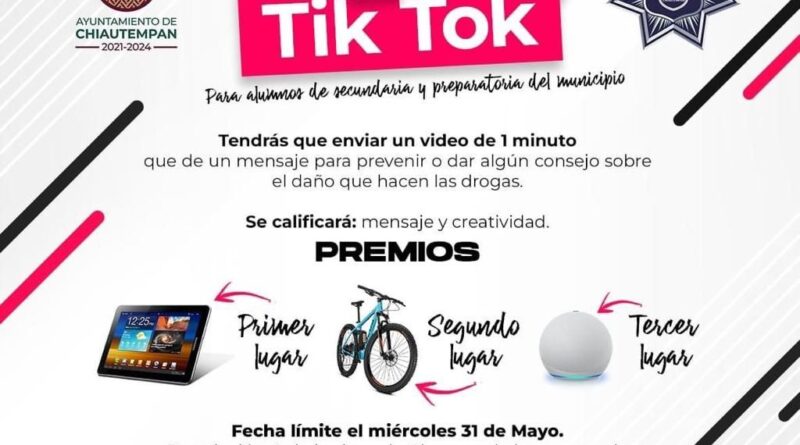 El Ayuntamiento de Chiautempan a través de la Dirección de Seguridad Pública Municipal, Vialidad y Protección Civil de Chiautempan, invita a estudiantes de secundaria y preparatoria a participar en el Concurso de Tik Tok, organizado en el marco de la Semana de prevención de adicciones.