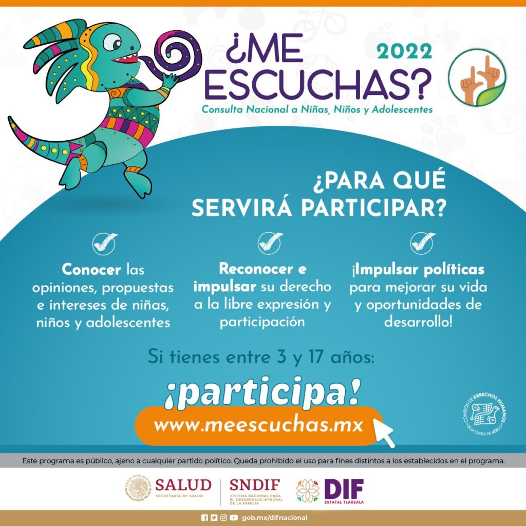 El Sistema Estatal para el Desarrollo Integral de la Familia (Sedif) invita a todas las niñas, niños y adolescentes a participar en la Consulta Nacional “¿Me escuchas? 2022” que estará disponible en línea durante todo el mes de julio, con el objetivo de conocer sus inquietudes e intereses en la vida cotidiana para que sean tomadas en cuenta en la construcción de políticas públicas que fortalezcan y protejan a este sector de la población.