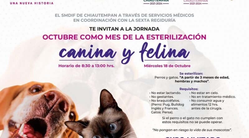 El Ayuntamiento de Chiautempan a través del Sistema Municipal para el Desarrollo Integral de la Familia (SMDIF), por medio de Servicios Médicos y en coordinación con la Sexta Regiduría, invitan a la población a la jornada de esterilización canina y felina.