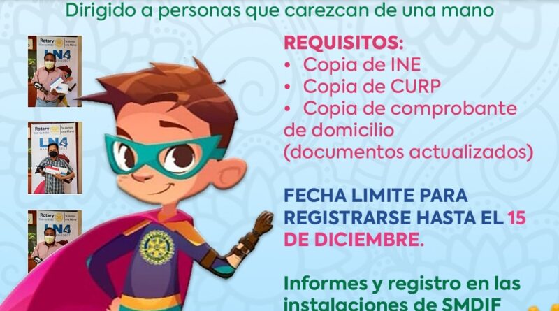 El Sistema Municipal para el Desarrollo Integral de la Familia (SMDIF) Huamantla, en conjunto con el Club Rotary Fundadores Huamantla, y LN4 Hand Project, invitan a la población que requiera de una prótesis de mano gratuita, a inscribirse en el programa “Te damos una mano”.