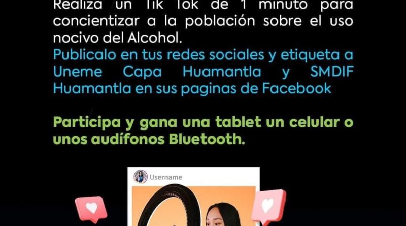 EL H. Ayuntamiento de Huamantla, a través del Sistema Municipal para el Desarrollo Integral de la Familia (DIF) Huamantla, y la Unidad de Especialidades Médicas del Centro de Atención Primaria en Adicciones (UNEME CAPA Huamantla), invitan a participar en el concurso de Tik Tok con motivo de la Conmemoración del Día Nacional Contra el Uso Nocivo de Alcohol, bajo el lema de: “El A-B-C del Uso Nocivo del Alcohol”.