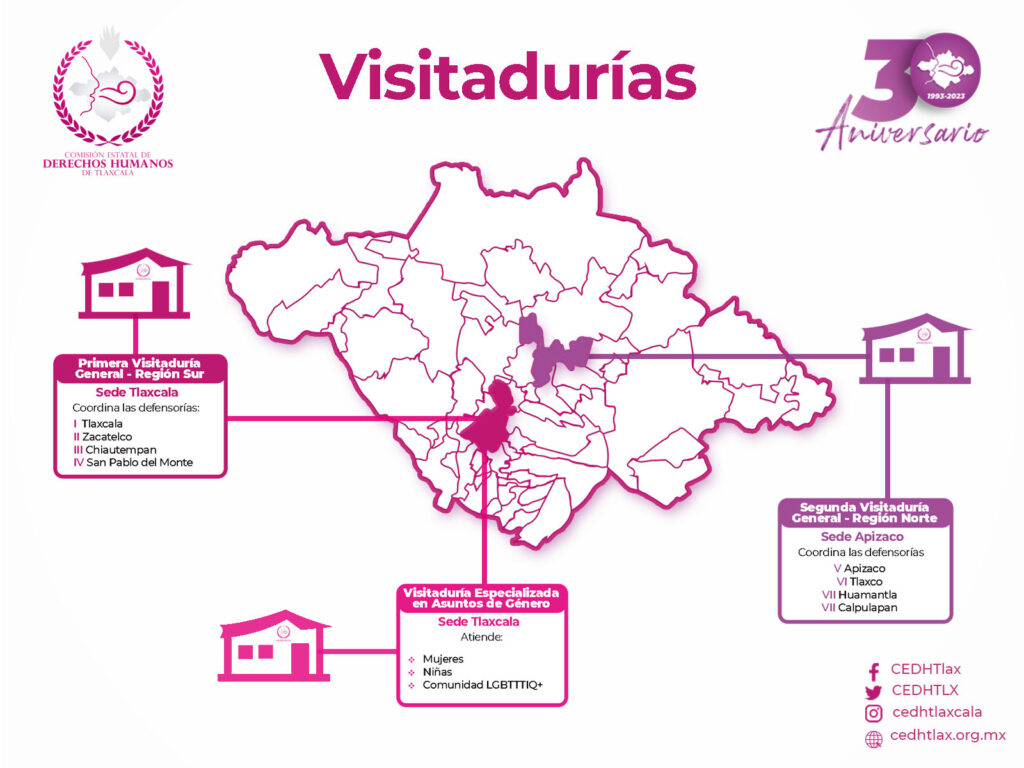 Las ocho Defensorías estarán coordinadas, a su vez, por dos Visitadurías creadas exprofeso por el Consejo Consultivo: la Primera Visitaduría General-Región Sur, que tendrá su sede en la ciudad de Tlaxcala, conocerá los trabajos de las Defensorías de Tlaxcala, Zacatelco, Chiautempan y San Pablo del Monte; y la Segunda Visitaduría General-Región Norte, con sede en la ciudad de Apizaco, coordinará las Defensorías de Apizaco, Tlaxco, Huamantla y Calpulalpan.