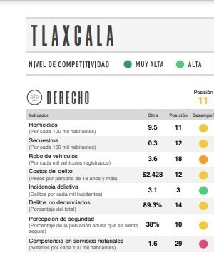 El resultado obtenido a través de la herramienta de análisis detalla que de 10 subíndices que evalúa; Tlaxcala se ubica en la posición número 11 en el subíndice de Derecho, en este la entidad observó el mejor desempeño.
