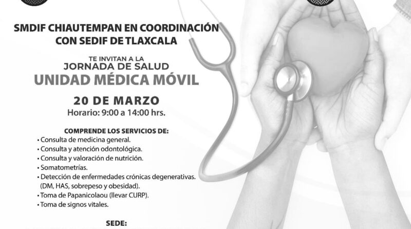 - En esta ocasión la Unidad Médica Móvil visitará la Presidencia de San Pedro Tlalcuapan en Chiautempan para realizar la Jornada de Salud, el próximo 20 de marzo